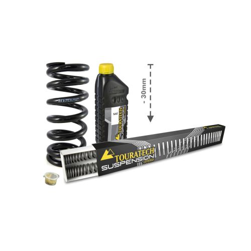 The height lowering kit by Touratech Suspension, from the Dutch specialist Hyperpro. The set includes replacement fork springs and a replacement spring for the shock absorber. This spring set provides you with a sensible 30mm reduction in height without affecting the riding properties - at the expense of a little ground clearance. The progressive springs have been designed to match the BMW F750GS perfectly, and offer a tremendous improvement in response and greater safety in extreme situations. Replacing the front and rear springs will lead to a significant improvement in your suspension system. Street legal.