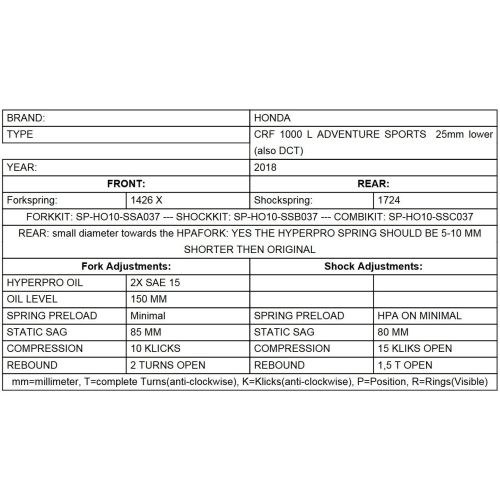 Replacement fork springs for lowering the front end by Dutch suspension specialists Hyperpro. This spring set provides you with a practical 25mm reduction in height without worsening the riding characteristics - at the expense of a little ground clearance. These progressive springs have been designed to match the Honda CRF1000L Africa Twin Adventure Sports perfectly, offering a tremendous improvement in response and greater safety in extreme situations than the original fork springs.
