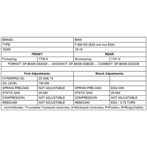 Full set by Hyperpro, the Dutch specialist for suspension products. The set includes replacement fork springs and a replacement spring for the shock absorber. The progressive springs have been designed to match the für BMW F850GS/Adventure perfectly, and offer a tremendous improvement in response and greater safety in extreme situations. Replacing the front and rear springs will lead to a significant improvement in your suspension system.