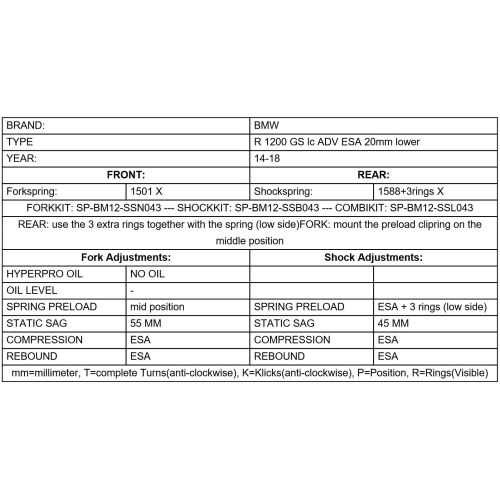 The height lowering replacement springs has been designed to match the BMW R1200GS(LC)/R1250GS Adventure perfectly This spring set provides you with a -20mm reduction in height without affecting the riding properties - at the expense of a little ground clearance. The progressive springs have been designed to match the original shocks BMW R1200GS(LC)/R1250GS Adventure perfectly, and offer good response and safety in extreme situations. The balance of your motorcycle remains fully intact..